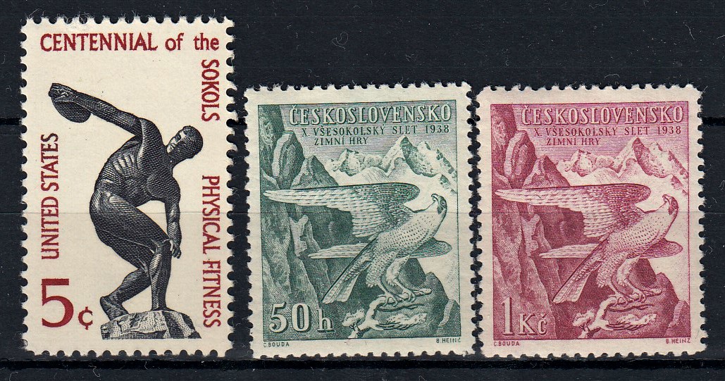 1862-ben két prágai férfi úgy döntött, sport-, pontosabban tornaegyesületet hoz létre az ép testben ép lélek közmondásra építve. A csehül sólymot jelentő Sokol-nak, nevezték el, ahol a tagok nemcsak sportoltak, hanem oktatáson is részt vehettek, közösségépítő programokat szervezhettek, így nem csak testüket erősíthették, de tudásukat is bővíthették. Az egyesület hamarosan mozgalommá vált és más szláv országokban is népszerű lett. Lengyelországban, Szerbiában, Ukrajnában, Oroszországban is hatalmas tömegeket vonzott az először csak férfiakat, később nőket is tagjukká fogadó szervezet. Bár az elejétől fogva elhatárolták magukat a szervezők a politikától, a Sokol a pánszlávizmus nacionalista eszméjének egyik melegágya lett. Ennek ellenére a bármilyen korú személyt befogadó közösség népszerűsége töretlen maradt. 1882-ben rendeztek először sok száz, majd több ezer fős tornafesztiválokat, amiket sletnek hívnak. 1912-ben tartották az első nemzetközi tornafesztivált, a harmincas évek végére pedig már 350 ezer tagot számlált a mozgalom. A Német Birodalom által elfoglalt területeken a játékokat betiltották, de a kommunizmus évei alatt sem nézték jó szemmel azokat. A kilencvenes években alakult újra a szervezet, de ekkorra már az Egyesült Államok és Kanada szláv lakossága körében is népszerű volt. Újra rendeztek tornafesztivált, 2000-ben 23 ezer résztvevővel. 2016-ben 26. alkalommal rendezték meg a Sokol USA eseményt, két évre rá pedig Prágában voltak játékok. A képen látható bélyegek közül az elsőt a St. Louis-ban alapított első amerikai Sokol századik évfordulójára bocsátotta ki az Amerikai Posta 1965-ben. A következő bélyegeket 1938-ban adta ki a Csehszlovák Posta a X. téli Sokol játékok alkalmával. Mindegyiken a vándorsólyom látható egy havas faágon.